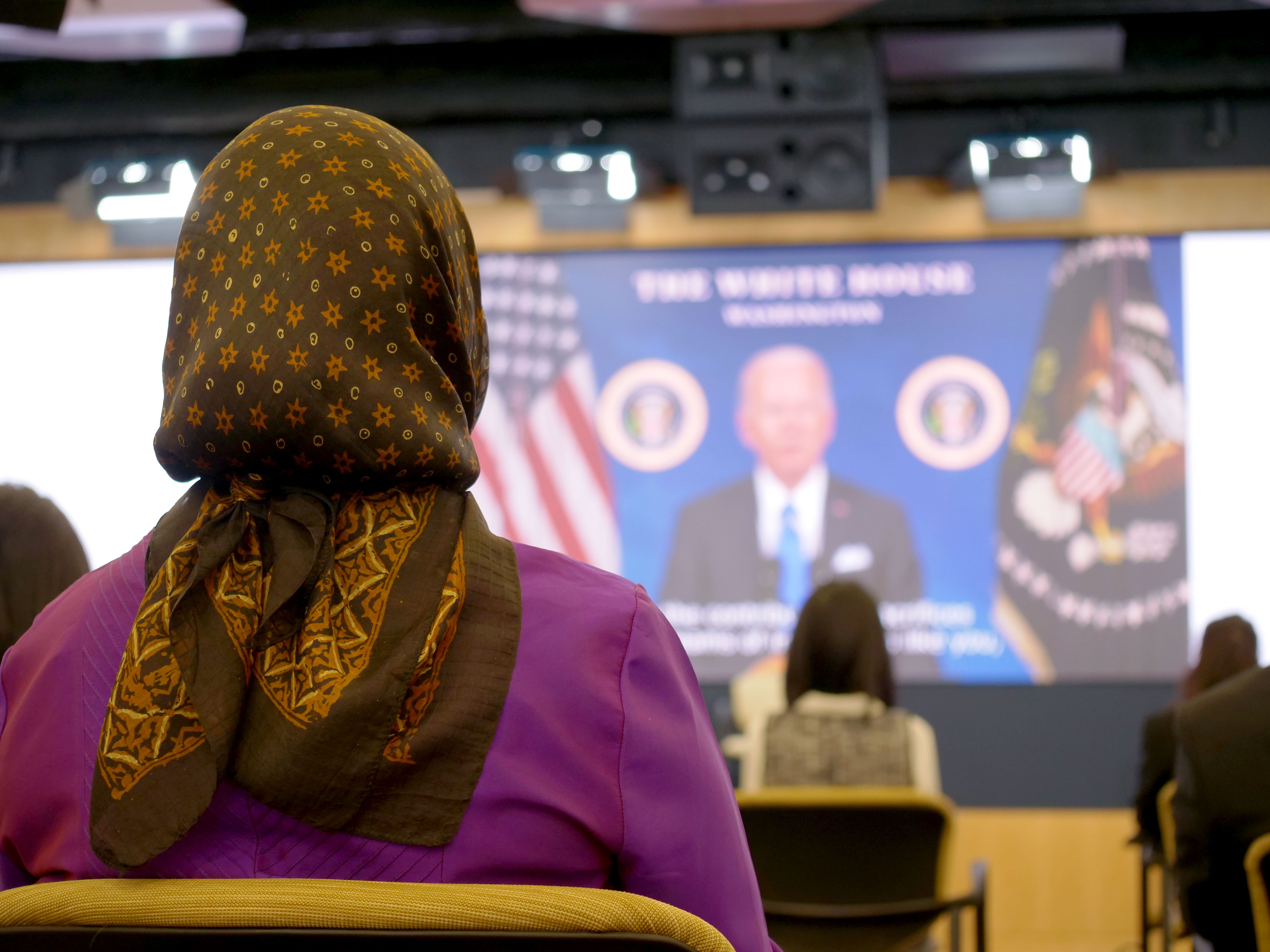 Nuevos ciudadanos observan el mensaje de felicitación del presidente en las oficinas centrales de USCIS