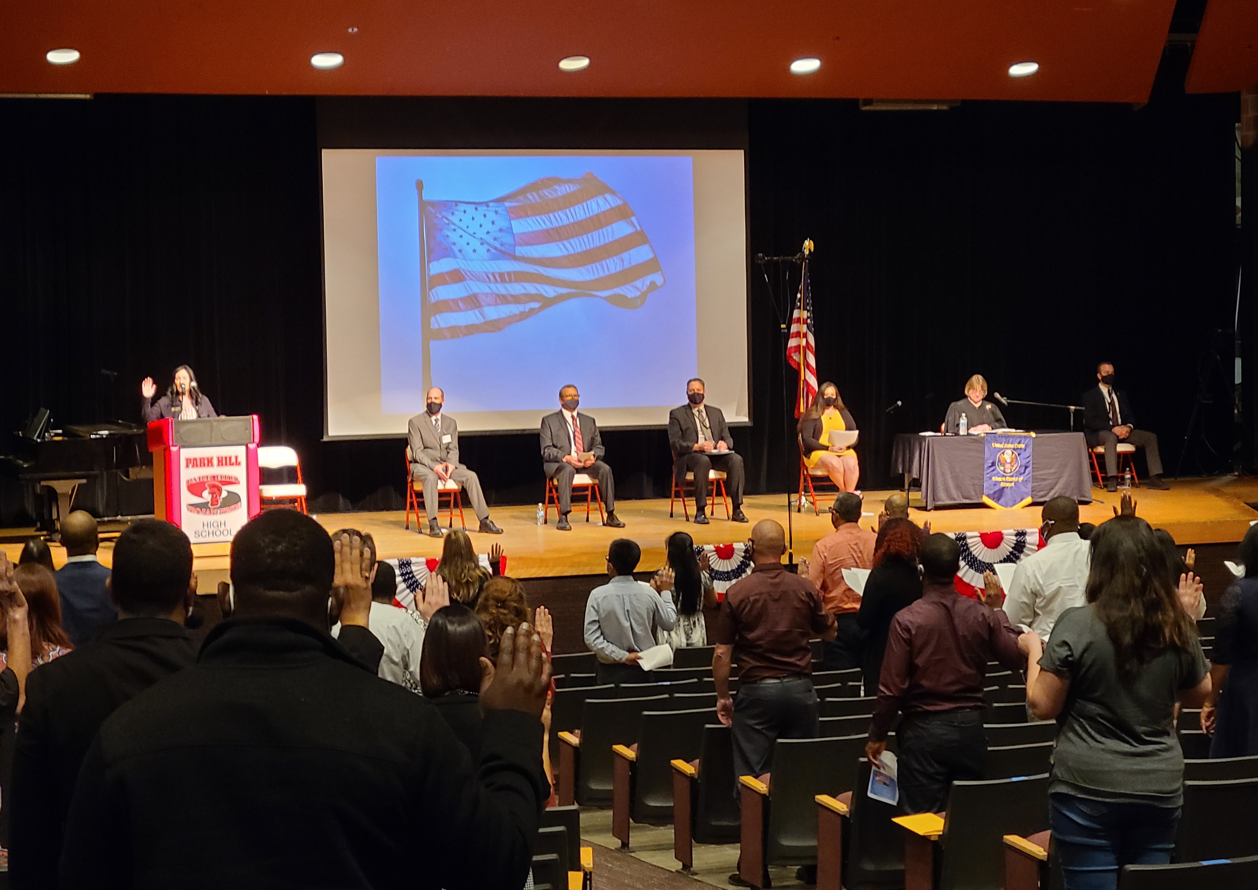 Personas prestan el Juramento de Lealtad en una escuela superior en Kansas