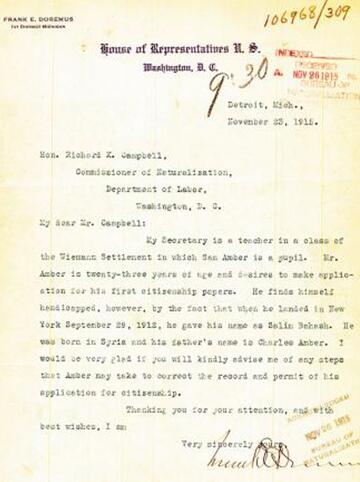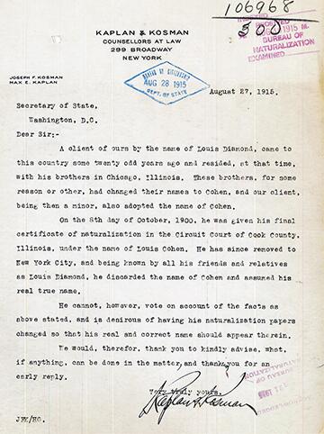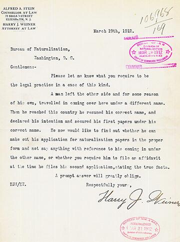 When an immigrant's new name no longer matched that shown on their official immigration record (ship passenger list), he or she might face difficulties voting, in legal proceedings, or naturalization. Below are some sample letters representing typical cases. All the examples come from official Immigration and Naturalization Service (INS) records now at the National Archives (Record Group 85) in Washington, DC, specifically Administrative Records Relating to Naturalization, 1906-1944 (Entry 26).